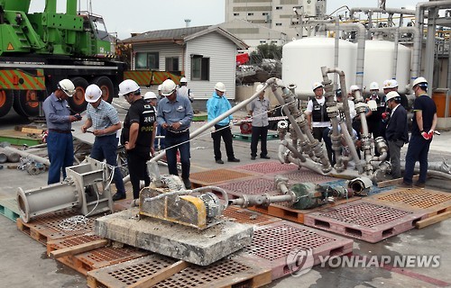 △ 한화케미칼 폭발사고 2차 현장감식 (울산=연합뉴스) 김용태 기자 = 경찰과 국립과학수사연구원은 4일 한화케미칼 울산2공장에서 전날 발생한 폐수처리장 저장조 폭발사고에 대해 2차 현장감식을 실시했다. 이날 경찰과 국과수 관계자들이 폭발현장에서 수거한 잔해를 살펴보고 있다. 2015.7.4 yongtae@yna.co.kr