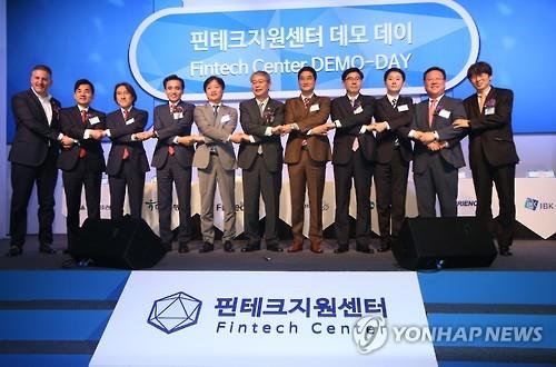 △ (서울=연합뉴스) 서명곤 기자 = 27일 오전 서울 종로구 그랑서울에서 열린 핀테크지원센터 2차 데모데이 행사에서 임종룡 금융위원장(가운데)이 신기술 개발에 상호 협력하는 내용의 양해각서(MOU)를 체결한 금융사와 핀테크 기업 대표들과 함께 기념촬영을 하고 있다. 2015.5.27 seephoto@yna.co.kr