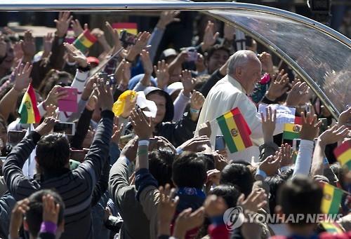 | △ 남미를 순방중인 프란치스코 교황이 9일(현지시간) 볼리비아의 산타 크루스에 있는 예수 그리스도 광장에서 인파들의 환영을 받고 있다.(AP=연합뉴스DB) |