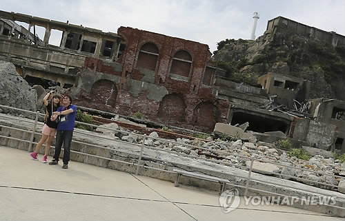 | △ 日 메이지시대 시설 '세계유산' 등재 (AP=연합뉴스) 유네스코 세계유산위원회는 일본 정부가 미쓰비시 조선소를 포함, 규수(九州)와 야마구치(山口) 지역 중심 근대화 산업시설 23곳을 하나로 묶어 등재 신청한 산업유산 시설들을 'Sites of Japan's Meiji Industrial Revolution: Iron and Steel, Shipbuilding and Coal Mining'(일본 메이지 산업혁명: 철강, 조선 그리고 탄광산업)이라는 이름으로 5일(현지시간) 세계유산에 등재했다. 이날 등재된 산업유산 23곳 중 7개소는 태평양전쟁 중에 조선인이 대규모로 강제동원돼 노동에 혹사된 곳. 사진은 세계유산에 등재된 나가사키 근해 하시마섬(일명 군함섬) 탄광 유적의 일부. bulls@yna.co.kr In this June 29, 2015 photo, tourists take a photo during a visit to Hashima Island, commonly known as Gunkanjima, which mean “Battleship Island,” off Nagasaki, Nagasaki Prefecture, southern Japan. Japanese officials expressed elation Monday, July 6, 2015, over the U.N. cultural body's approval of world heritage status for 23 historic sites illustrating the country's transformation into an industrial power at the end of the 19th century. (AP Photo/Eugene Hoshiko) |