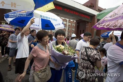 △ 올해 6월 8일 중국 가오카오 시험 후 자녀에게 꽃다발 건네는 어머니(AP=연합뉴스DB)