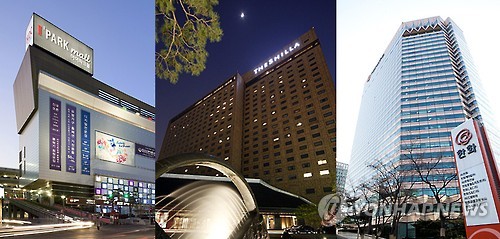 | △ HDC신라·한화, 서울 신규 면세점 '황금티켓' 획득 (서울=연합뉴스) '황금티켓'으로 불린 서울지역 신규 대형 면세점 특허권 2장을 놓고 벌인 대기업 간 싸움에서 현대산업개발과 호텔신라의 합작법인인 HDC신라면세점과 한화그룹 계열인 한화갤러리아타임월드가 승리했다. 사진은 현대산업개발 본사(왼쪽부터)와 호텔신라, 한화 본사. |