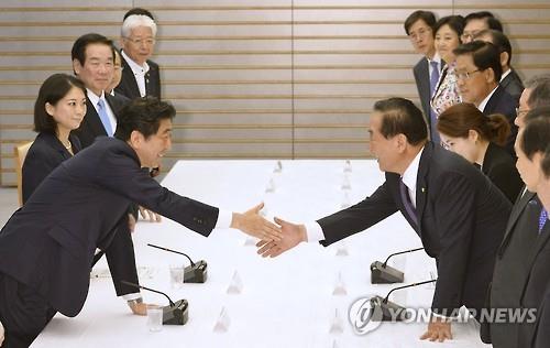 | △ 한일의원연맹 회장인 서청원 새누리당 의원과 아베 신조(安倍晋三) 일본 총리가 2015년 7월 10일 일본 도쿄도(東京都) 총리관저에서 만나 서로 손을 내밀고 있다. (교도=연합뉴스) |