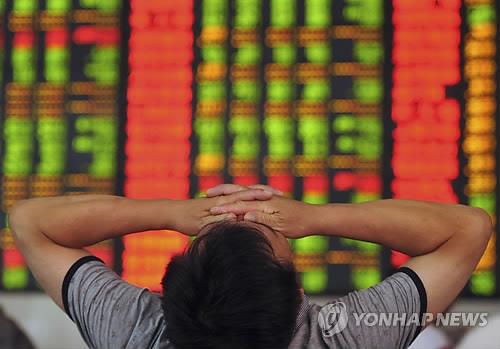 | △ 지난 8일(현지시각) 중국 중부 안후이 성 푸양의 증권사에서 한 주식 투자자가 주식 전광판 앞에서 두 눈을 가린 채 탄식하고 있다. (AP=연합뉴스 자료사진) |