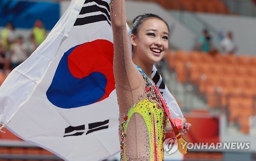 | △ <U대회> 금메달 미소 (광주=연합뉴스) 박동주 기자 = 12일 광주여대 유니버시아드체육관에서 열린 2015 광주하계유니버시아드대회 여자 리듬체조 개인종합 시상식에서 금메달을 획득한 한국 손연재가 태극기를 들고 환하게 웃고 있다. 2015.7.12 pdj6635@yna.co.kr |