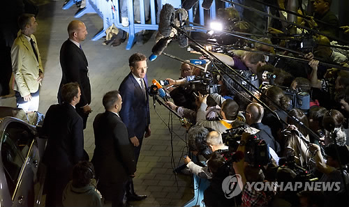 | △ 도날드 투스크 유럽연합(EU) 정상회의 상임의장은 그리스 사태와 관련해 12일(현지시간) 예정된 EU 정상회담을 취소하고 유로존(유로화 사용 19개국) 정상들만 모여 논의할 예정이라고 밝혔다. 사진은 유로그룹(유로존 재무장관 협의체) 의장인 예룬 데이셀블룸 네덜란드 재무장관(가운데)이 11일 브뤼셀에서 유로그룹 회의가 끝난 뒤 기자회견을 하는 모습. (브뤼셀 AP=연합뉴스) |
