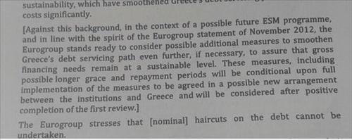 초안은 또 "유로그룹은 명목 부채 헤어컷을 수행할 수 없다는 것을 강조한다"며 그리스가 요구한 헤어컷을 거부했다.