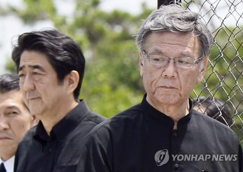 | △ 2015년 6월 23일 일본 오키나와(沖繩)현 이토만(絲滿)시에서 열린 전몰자 추도식에서 아베 신조(安倍晋三, 왼쪽) 일본 총리와 오나가 다케시(翁長雄志) 오키나와 지사가 헌화하기 위해 이동하고 있다.(교도=연합뉴스 자료사진) |