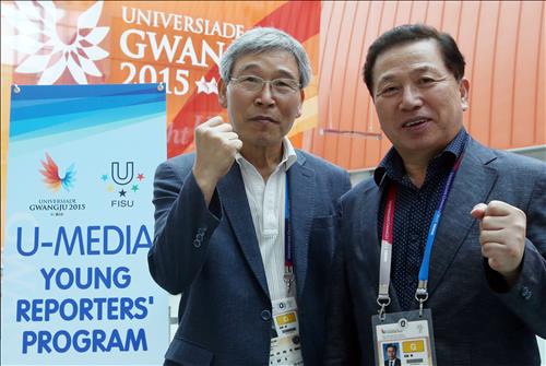 | △ 광주 하계유니버시아드에서 기자 지망생 '영리포터'들을 지도하는 원로 언론인 김정연(좌) 멘토와 김벽수 멘토. |