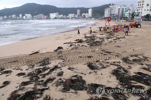 △ 해수욕장에 태풍이 남긴 흔적 (부산=연합뉴스) 조정호 기자 = 제9호 태풍 '찬홈'이 지나간 13일 부산시 해운대구 송정해수욕장 백사장에서 미화원들이 거센 파도에 밀려온 6t 가량의 해초를 수거하고 있다. 2015.7.13 ccho@yna.co.kr