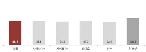 매체별 KAI는 지상파TV 95.5, 케이블TV 94.3, 라디오 97.3, 신문 93.2, 인터넷 108.3으로, 인터넷을 제외한 전 매체가 7월 대비 감소세를 보일 전망이다.