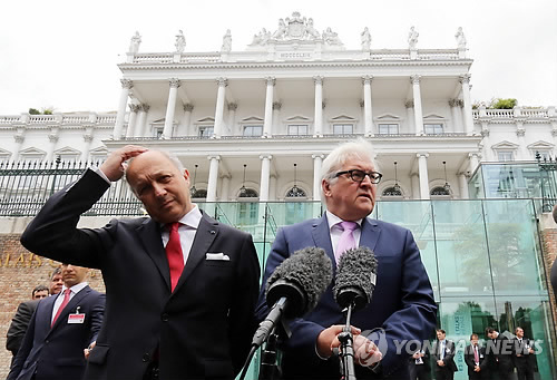 | △ 빈의 비공개 협상장인 호텔 '팔레 코부르크' 앞에서 로랑 파비우스(왼쪽) 프랑스 외무장관과 프랑크-발터 슈타인마이어 독일 외무장관이 함께 기자들에게 협상 상황을 설명하고 있다. (AP=연합뉴스) |