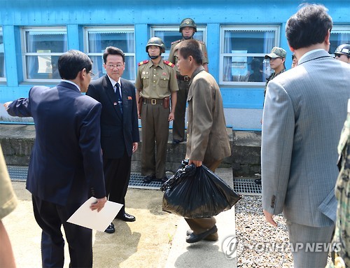 △ 송환되는 북한 선원 (서울=연합뉴스) 지난 4일 울릉도 근해에서 구조된 북한 선원 5명 중 북측으로 돌아가기를 원하는 선원이 14일 판문점을 통해 송환되고 있다. 2015.7.14 << 통일부 제공 >> photo@yna.co.kr