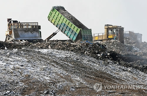 △ 매립되는 수도권 쓰레기 (인천=연합뉴스) 윤태현 기자 = 인천시가 2016년 수도권매립지 사용을 종료한다는 기존 원칙을 고수한 가운데 3일 오전 인천시 서구 수도권매립지에서 한 근로자가 수도권에서 수집한 쓰레기를 매립지역에 내리고 있다. 2014.12.3 tomatoyoon@yna.co.kr