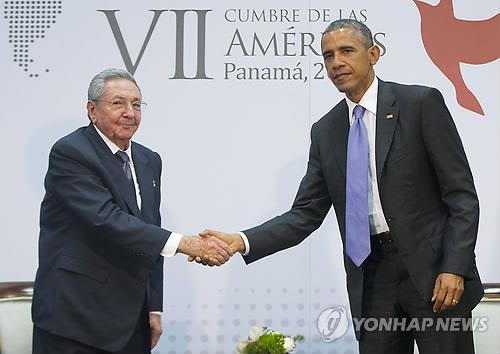 | △ 지난 4월 파나마에서 만나 악수하는 라울 카스트로 쿠바 국가평의회 의장과 버락 오바마 미국 대통령(AP=연합뉴스) |