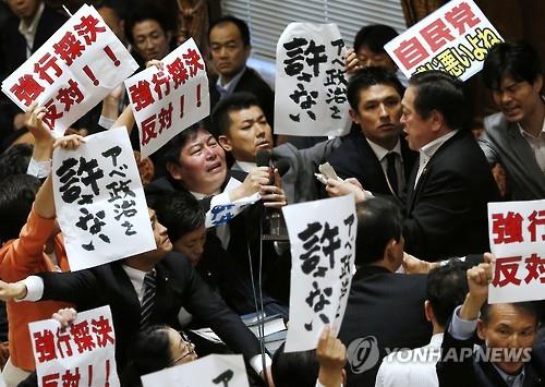 (도쿄=연합뉴스) 조준형 이세원 특파원 = 일본 아베 신조(安倍晋三) 정권이 위헌 논란에 휩싸인 집단 자위권 법안을 중의원(하원)에서 강행 처리했다.