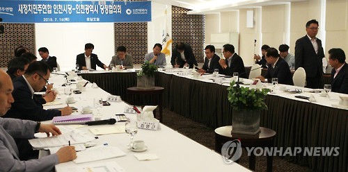 | △ '인천 쓰레기 매립지 논란' 당정협의회 열려 (인천=연합뉴스) 최은지 기자 = 유정복 인천시장을 비롯해 새정치민주연합 인천시당위원들이 참석한 '새정치민주연합 인천시당-인천광역시 당정협의회'가 16일 오전 인천시 남동구 간석동 로얄호텔에서 열리고 있다. 2015.7.16 chamse@yna.co.kr |