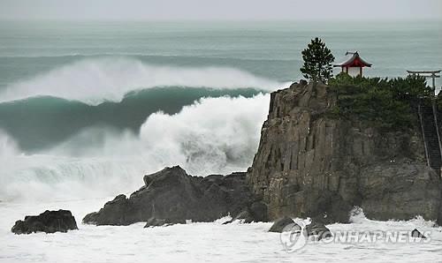 | △ (고치<일본> AP=연합뉴스) 제11호 태풍 '낭카'의 영향권에 들어간 일본 시코쿠 지방 고치 해안에 16일(현지시간) 거대한 파도가 들이치고 있는 모습. |