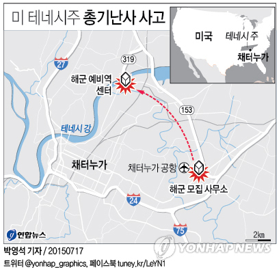 | △ <그래픽> 미 테네시주 총기난사 사고 (서울=연합뉴스) 박영석 기자 = 미국 테네시 주 채터누가의 해군 모집 사무소와 해군 예비역 센터 등 두 곳의 군 시설에서 16일 오전 11시께(현지시간) 총격 사건이 발생했다. 이 사건으로 현역 미 해병 4명이 숨지고 3명이 다쳤다. 경찰은 용의자 역시 사망했다고 밝혔다. zeroground@yna.co.kr |