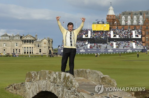 그러고는 세인트 앤드루스를 상징하는 다리인 '스윌컨 브리지'로 위로 걸어 올라가 갤러리의 박수갈채와 사진기자들의 플래시를 한몸에 받으며 양손을 번쩍 들어 올렸다.