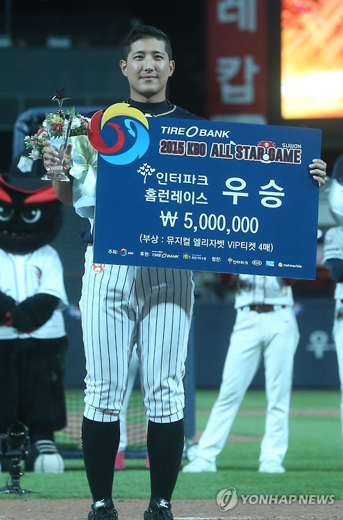 (수원=연합뉴스) 신창용 기자 = 황재균(28·롯데 자이언츠)이 우승 트로피를 차지한 2015 프로야구 올스타전 홈런 레이스는 행사 결과보다는 에릭 테임즈(29·NC 다이노스)의 한마디 때문에 커다란 화제를 낳았다.