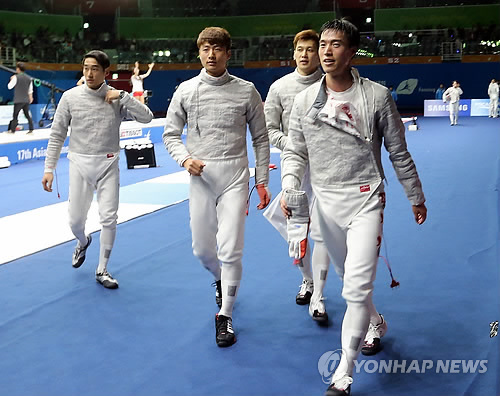 | △ 한국 펜싱 남자 사브르 국가대표팀. 왼쪽부터 김정환, 오은석, 구본길, 원우영(연합뉴스 자료사진) |