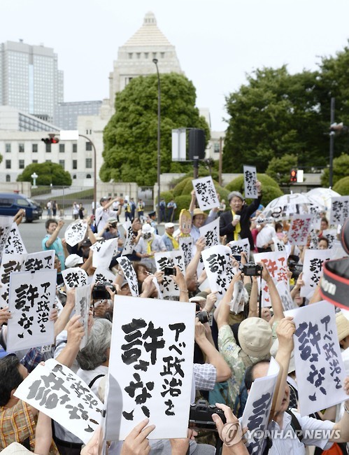 | △ 日저항민심의 상징 구호…"아베정치 용서안해" (도쿄 교도=연합뉴스) 집단 자위권 법안에 대한 일본 시민사회의 저항이 계속되고 있는 가운데, '아베 정치를 용서하지 않겠다'는 글귀가 적힌 종이가 시위의 상징물로 부상했다. 18일 도쿄 국회의사당 앞에서 시민들이 '아베 정치를 용서하지 않겠다'는 글귀가 적힌 종이를 든 채 연립여당의 집단 자위권 법안 강행 처리(중의원)에 항의하는 시위를 벌이는 모습이다. 2015.7.19 jhcho@yna.co.kr |
