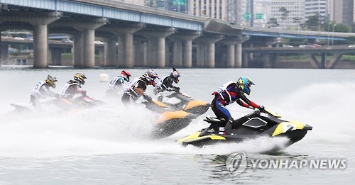 | △ 더위 탈출 (서울=연합뉴스) 안정원 기자 = 19일 오전 한강몽땅 여름축제의 일환으로 서울 여의도공원에서 열린 전국수상오토바이대회 스파크 부문에 참가한 선수들이 실력을 겨누고 있다. 2015.7.19 jeong@yna.co.kr |