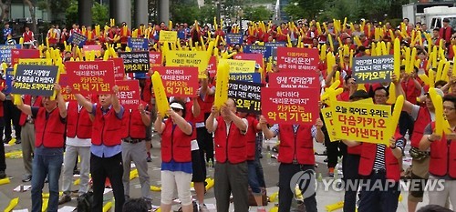 | △ "다음카카오 대리운전 시장 진출 반대" (서울=연합뉴스) 전국대리운전연합회 소속 회원들이 20일 오후 경기도 성남시 분당구 다음카카오 사옥 앞에서 집회를 열고 다음카카오 대리운전사업 진출 반대를 위한 구호를 외치고 있다. (전국대리운전연합회 제공) |
