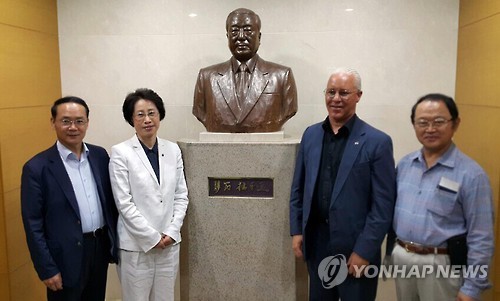 △ 대한항공 테크센터 방문한 NASA 연구소 관계자 (인천=연합뉴스) 지난 17일 대한항공 항공우주사업본부 테크센터를 방문한 NASA 랭글리 연구소의 로버트 브라이언트 박사(왼쪽 세번째)가 한진그룹 창업주인 고 조중훈 회장의 흉상 앞에서 최순자 인하대 총장(두번째)과 기념촬영을 하고 있다. 2015.7.20 <<인하대 제공>>