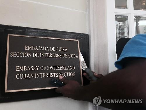 △ 20일 쿠바 대사관 개관을 앞두고 지난 15일 쿠바 이익대표부 현판이 제거되고 있다. (AP=연합뉴스)