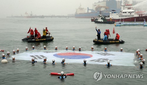 기합과 함께 바다로 뛰어든 수십 명은 수면에 대형 태극기를 펼쳐보이며 다시 한번 파이팅을 외쳤다.
