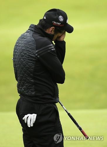 (서울=연합뉴스) 김태종 기자 = 마지막 18번 홀(파4) 버디 퍼팅한 볼이 홀컵을 향해 굴러가다가 홀 앞에서 서 버리자, 제이슨 데이(호주)는 얼굴을 움켜쥐었다.