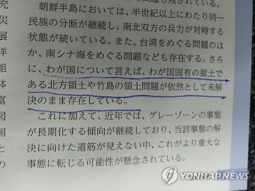 △ 올해 日방위백서의 독도 관련 기술 (도쿄=연합뉴스) 조준형 특파원 = 21일 확정된 올해 일본 방위백서의 독도 관련 기술. "우리나라 고유 영토인 북방영토(쿠릴 4개섬의 일본식 표현)나 다케시마(竹島·일본이 주장하는 독도의 명칭)의 영토문제가 여전히 미해결된 채로 존재하고 있다"는 표현이 담겼다.