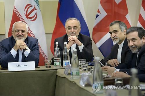 △ 지난 3월 스위스 로잔에서 진행된 이란 핵협상에 참가한 모하마드 자바드 자리프 이란 외무장관(왼쪽)과 알리 아크바르 살레히 이란 원자력청장(왼쪽에서 두번째) 등 이란측 대표단 모습. (AP=연합뉴스 자료사진)