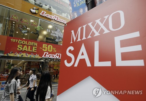 △ People walk past sale signs at a Seoul shopping district, South Korea, Thursday, July 23, 2015. South Korea's quarterly growth slowed to the lowest in more than two years as a severe drought hit agriculture and an outbreak of Middle East respiratory syndrome sapped consumption.(AP Photo/Ahn Young-joon)
