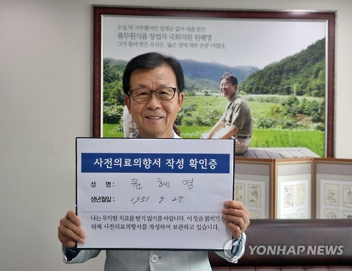 △ 국회의원 38명, '존엄한 죽음 캠페인' 나섰다 (부천=연합뉴스) '웰다잉 문화조성을 위한 국회의원 모임'은 23일 존엄한 생을 아름답게 마감하기 위한 취지에서 '사전의료의향서 365 캠페인'을 시작했다. 이 모임의 공동대표인 새정치민주연합 원혜영 의원(부천 오정)은 "암 사망 환자 3명 중 1명은 자신의 의사와 상관없이 가족의 요구로 연명치료를 받다가 고통스럽게 삶을 마감한다"며 "죽음에 대한 자신의 생각을 미리 밝혀 존엄한 생을 아름답게 마무리하도록 하기 위해 캠페인을 벌이게 됐다"고 설명했다. 사진은 원 의원이 작성한 사전의료의향서 확인증을 들고 있는 모습. 2015.7.23 <<원혜영 의원 제공>>