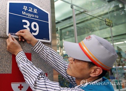 | △ 오는 8월부터 5자리로 된 새 우편번호(국가기초구역번호)가 도입됨에 따라 한 집배원이 서울 종로구 일대 건물에 새 우편번호 스티커를 붙이고 있다. (연합뉴스 자료사진) |