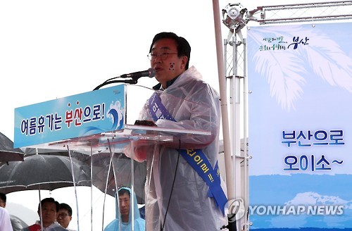 △ 부산 메르스 종식 선포 (부산=연합뉴스) 조정호 기자 = 20일 부산 해운대해수욕장에서 서병수 시장이 메르스 종식을 선포하고 있다. 부산에서는 지난달 6일 첫 메르스 환자가 발생한 이후 방역당국의 관리를 받은 사람이 1천400여명에 달했지만 모두 격리 해제됐다.