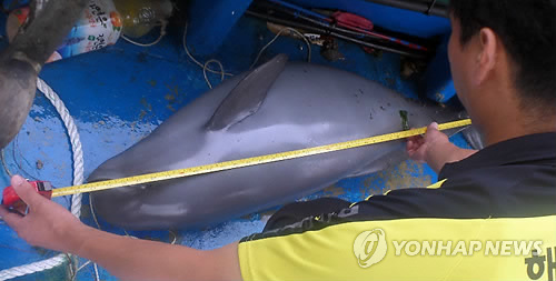 △ 진해 앞바다서 죽은채 발견된 상괭이 (창원=연합뉴스) 창원해양경비안전서 직원이 24일 오전 경남 창원시 진해구 잠도 앞바다에서 그물에 걸려 죽은 채 발견된 상괭이를 조사하고 있다. 2015.7.24 <<창원해양경비안전서>> seaman@yna.co.kr