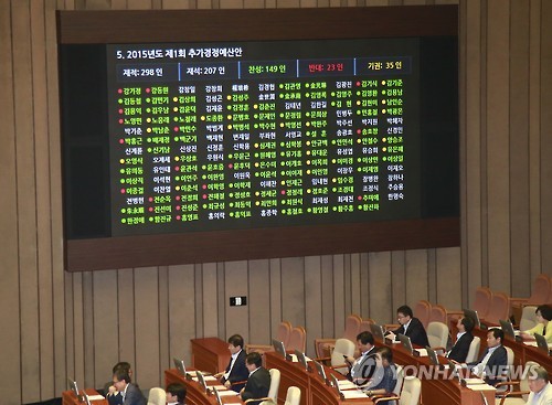 △ 2015년도 추가경정예산안 통과 (서울=연합뉴스) 이상학 기자 = 24일 국회에서 열린 제335회 국회(임시회) 제2차 본회의에서 2015년도 제1회 추가경정예산안이 통과되고 있다.