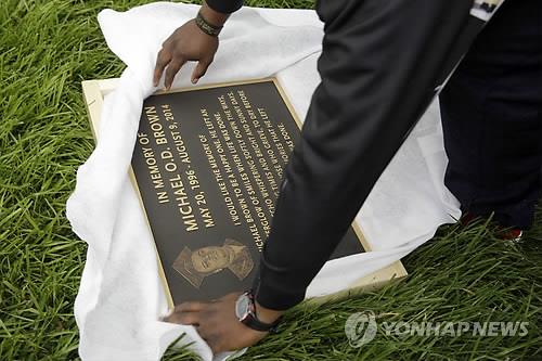 | △ 퍼거슨 총격현장에 마이클 브라운 추모명판 (퍼거슨 AP=연합뉴스) 지난해 8월 미국 미주리주 퍼거슨에서 백인 경관의 총을 맞고 사망한 비무장 흑인 청년 마이클 브라운(18)의 아버지가 지난 5월20일(현지시간) 임시 추모소가 있던 곳에 아들을 기리는 명판을 놓고 있다. 이 장소는 브라운이 경관의 총격을 받고 쓰러진 곳이다. |