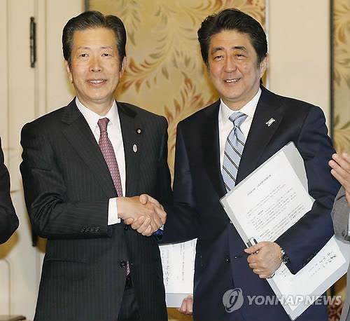 | △ 일본의 집권 자민당 총재인 아베 신조(安倍晋三·오른쪽) 총리와 연립 여당인 공명당의 야마구치 나쓰오(山口那津男) 대표가 2014년 12월 16일 일본 국회에서 헌법 개정 등에 관한 사항이 포함된 연립정권 합의문에 서명하고서 악수하고 있다.(교도=연합뉴스 자료사진) |