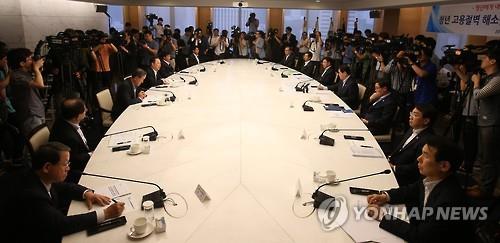 △ (서울=연합뉴스) 한종찬 기자 = 27일 서울 중구 세종대로 대한상공회의소에서 열린 청년 고용절벽 해소를 위한 민관합동 대책회의에서 박용만 대한상의 회장이 모두발언을 하고 있다.