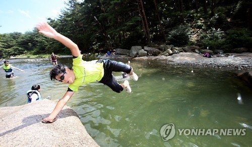 △ 다이빙은 이렇게 (울산=연합뉴스) 이상현 기자 = 27일 울산에 폭염경보가 발효된 가운데 울산 12경의 한 곳인 울주군 작괘천에서 청소년들이 계곡에 다이빙하고 있다. 2015.7.27 leeyoo@yna.co.kr