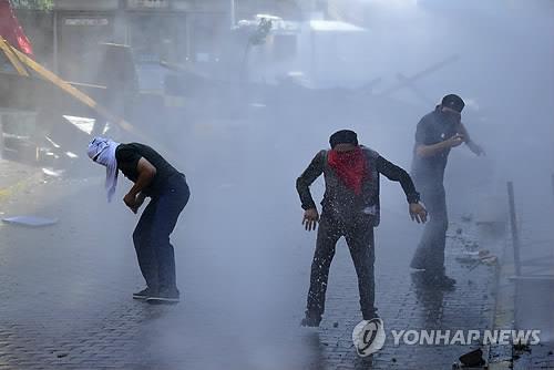 | △ (AP=연합뉴스) 26일(현지시간) 터키 이스탄불에서 터키군의 쿠르드 민병대에 대한 군사작전을 비난하는 시위 참가자들이 얼굴을 수건으로 가린 채 경찰의 최루가스 진압에 맞서고 있다. |