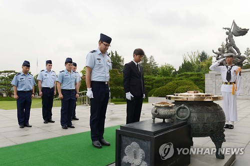 △ 묵념하는 호주공군 77대대 방문단 (서울=연합뉴스) 6·25전쟁 65주년을 맞아 한국 공군을 방문하기 위해 입국한 호주공군 77대대 방문단이 지난 27일 국립서울현충원을 방문, 묵념하고 있다. (공군 제공)