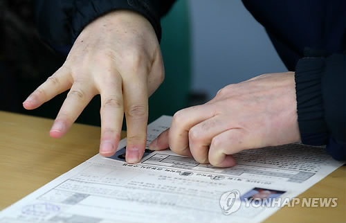 △ 지난 2월 제1차 초·중·고졸 검정고시 응시 접수를 위해 서울 용산공업고등학교를 찾은 한 수험생이 원서에 사진을 붙이고 있다. (연합뉴스 자료사진)