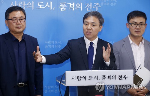 | △ 전주종합경기장 시민공원 조성 계획 밝히는 김승수 시장 (전주=연합뉴스) 홍인철 기자 = 김승수(가운데) 전북 전주시장은 14일 기자간담회를 통해 "지리적·역사적으로 전주의 심장부에 있는 종합경기장 부지를 시민에게 돌려주기로 했다"며 시민공원 조성계획을 밝혔다. 2015.7.14 <<전주시>>.DB. ichong@yna.co.kr |