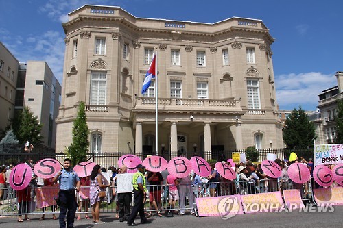 | △ 미국 워싱턴D.C. 백악관에서 불과 2.5㎞ 정도 떨어진 16번가의 쿠바 대사관 앞 도로에 쿠바계 지지자들이 분홍색 우산 바깥쪽 하나하나에 로마자 알파벳을 하나씩 새겨 넣어 '미국과 쿠바는 아미고'(US CUBA AMIGOS)라는 문구를 만들었다 (AP=연합뉴스) |